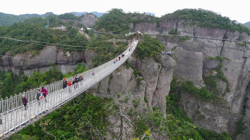爬了半個小時左右,我們終于登上了頂峰。剛上來那一霎那,那風(fēng)吹的,再加上眼前那些美景,心里那個爽真不是言語能夠形容出來的,一上來我就狂拍照,真想把這所有的美景都統(tǒng)統(tǒng)帶回去??紤]到老媽他們膽小還有舅舅年高,讓他們帶著小孩在邊上休息,我拉著老爸還有侄女他們向天橋飛奔而去??删驮诳焐先ツ且划?dāng)下,我猶豫了,因為我感覺自己多少有點恐高,心里開始擔(dān)心那鋼絲繩會不會斷,要是斷了怎么辦,可又實在想去,于是暗自鼓足了氣,拄著手中的拐杖上去了。天橋有