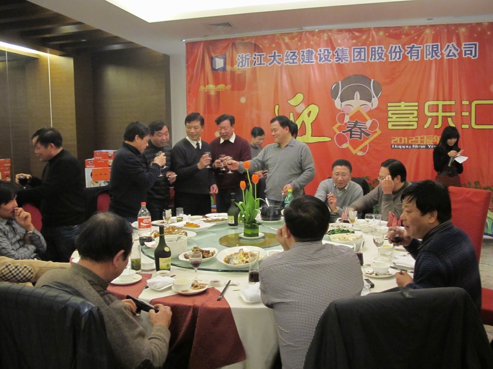 宴會開始前,辦公室人員對參加宴會的人員實行簽到制度并依次發(fā)放耀達商場購物卡,讓大家感受到了集團公司對每位員工的濃濃情意。六點,與會人員紛紛入席后,建設(shè)局副局長王黎明和大經(jīng)公司總經(jīng)理胡明先后致辭,在肯定大經(jīng)集團在2011年取得的成就的同時,希望公司作為臨海市的龍頭企業(yè)能夠在新的一年里龍騰虎躍、更上一層樓,并祝愿每位員工龍馬精神。而后主持人宣布宴會正式開始。