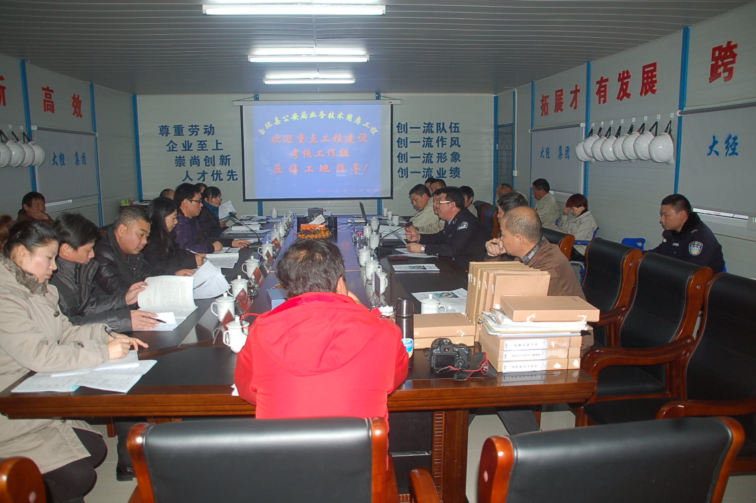 浙江大經(jīng)建設(shè)集團玉環(huán)縣公安局業(yè)務(wù)技術(shù)用房工程項目部現(xiàn)場經(jīng)理陶定寶向蒞臨領(lǐng)導和專家就本工程的施工組織、人機配備、場區(qū)布置、質(zhì)量控制、進度實施與計劃、安全與文明施工措施落實、業(yè)主監(jiān)理施工三方的配合等綜合情況進行了匯報,同時也通過VCR向考核工作組展示了現(xiàn)場的實際狀態(tài),項目部的前期工作得到了考核組領(lǐng)導們的肯定。