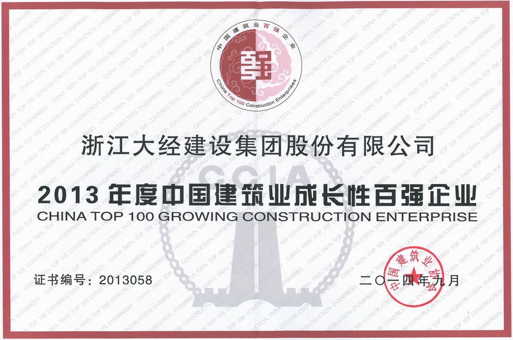 9月10日,2013年度中國建筑業(yè)“雙百強(qiáng)”企業(yè)發(fā)布會在貴陽市召開。浙江大經(jīng)建設(shè)集團(tuán)憑借優(yōu)秀的綜合實力,以優(yōu)異的成長性指數(shù),入選“2013年度中國建筑業(yè)雙百強(qiáng)企業(yè)成長性百強(qiáng)企業(yè)”第58名。