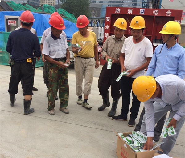 進入盛夏季節(jié),氣溫升高,這給正常施工帶來了諸多影響。為切實做好夏季防暑降溫工作,保障施工現(xiàn)場一線人員的身體健康,6月,集團公司向項目部一線人員發(fā)放了人丹、藿香正氣水、十滴水、風油精等防暑降溫藥品,有力促進了現(xiàn)場施工安全高效推進,激發(fā)了作業(yè)人員的愛崗敬業(yè)熱情。